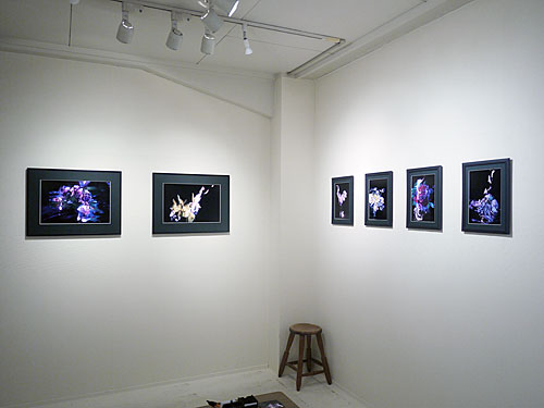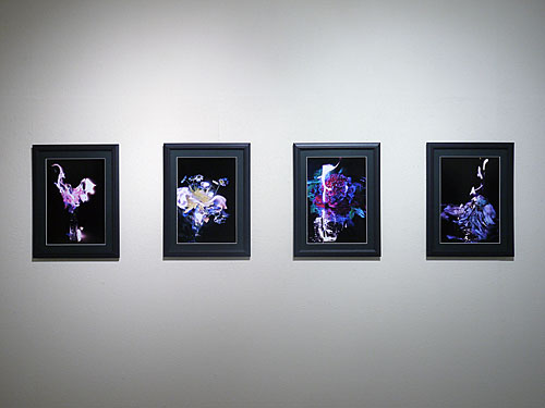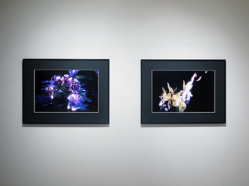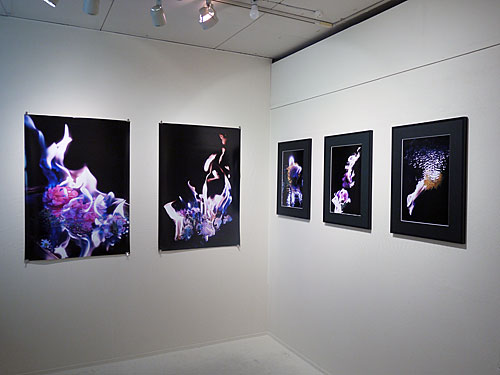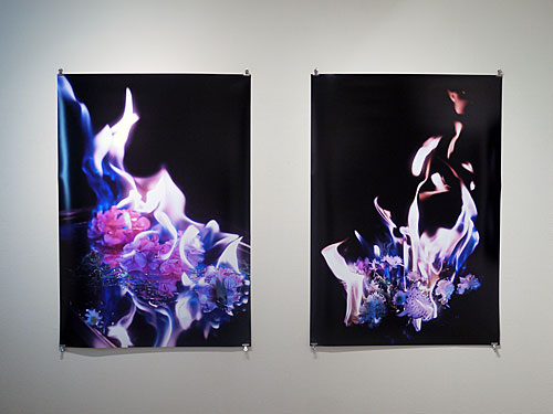夜間に天候や風向きに左右される野外で撮影しています。生花が燃え尽きるまでを連写し、沢山の写真の中からより良いものを選択しています。炎は合成せず、有機的な自然の形の美しさや緊張感をそのまま表現しています。インクジェットプリント20枚を展示予定。