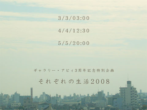 ●それぞれが過ごした同じ瞬間を共有するプロジェクト 3月3日午前3時 4月4日午後12時半 5月5日午後8時 あらかじめ決められたこの3つの日時にみんなでいっせいに写真を撮ります。その時、自分がいた場所。その時、自分が見ていた光景。それぞれが同じ瞬間に別々の場所で過ごした何気ない生活風景が集まることにより、すごく面白い発見があることを表現します。 最後は全部の写真を参加者で分配し、時間の共有が行われます。アビィの周年記念で恒例の人気展示です。