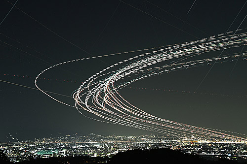 夜空をゆく飛行機の航空灯を1分間あたり30〜120枚というペースで何千枚もコマ撮りした写真を1枚に合成すると、その軌跡が独特な形状の図形として浮かび上がります。